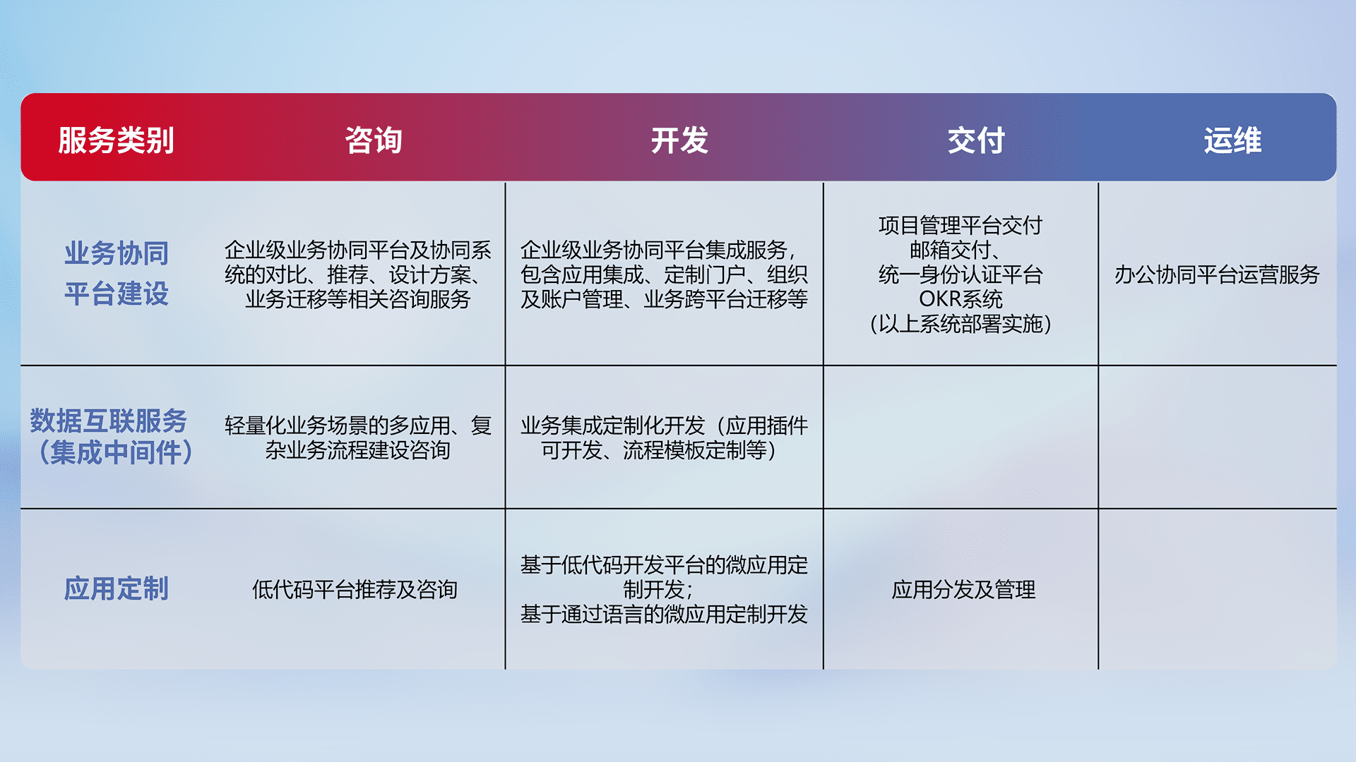针对钉钉、、、、企微、、、IDaas等平台级产品提供产品的规划、、、方案、、、、交付、、、定制化开发等服务,,实现如统一协同办公、、智能客户服务、、、混合会议管理、、、智能数据查询、、、、等业务场景,,,,实现数字化转型。。